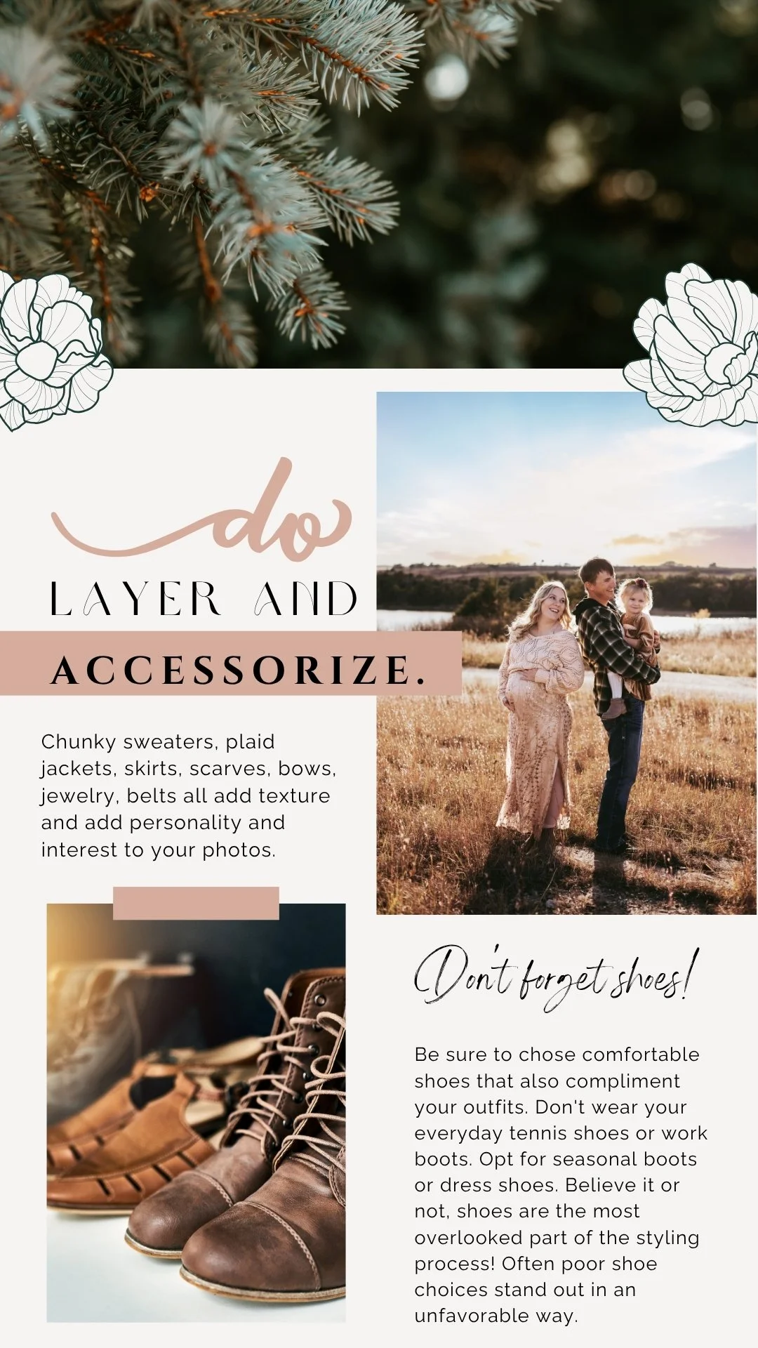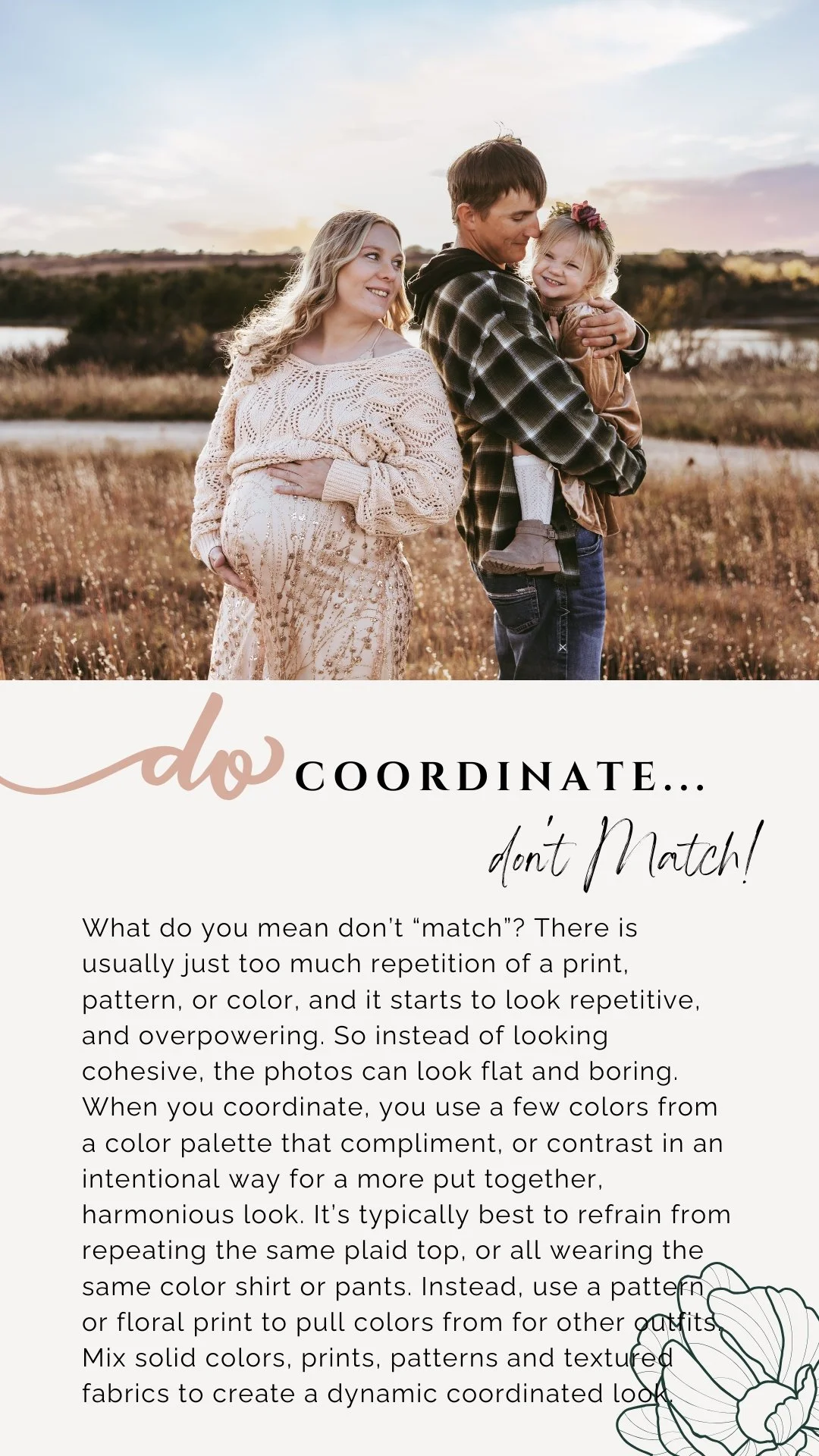 When looking for outfits, try to find a print, color scheme or outfit you love and are inspired by, either for you, your child or your spouse. Use that outfit as your starting point to curate the rest of the looks. It helps if your outfit has a remade color palette or print to help you pull color for the other outfits from. Use a mix of solids, prints, and textures to create a cohesive, well-coordinated look. Remember to use layers when possible and find shoes that match the look and are clean, work with the location you are taking pictures in, and be sure to share your photos of your outfits with your photographer! This greatly helps us photographers to find the perfect locations for your outfits and the vibe you have in mind. This “Earthy Tones” style board would be very versatile in any natural outdoor space and good for spring through fall colors as well! Plus, these are outfits your whole family can rewear during the year!