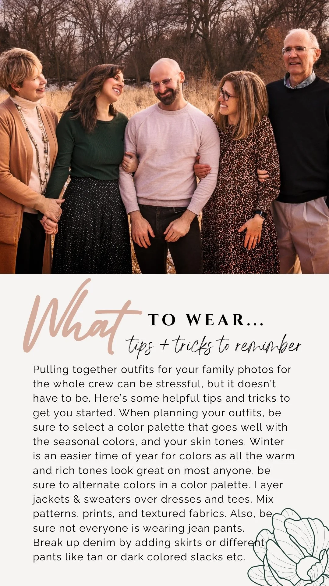 Okay, so you’ve done the hard part! You’ve checked out all the local photographers, selected the one you like best for their style, quality and for your budget, and booked your mini session. Now what? It’s time to start putting together your family’s outfits!